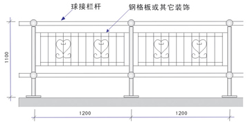 在球接欄桿基礎(chǔ)上配設(shè)帶有各種裝飾的鋼格板或其他形式的裝飾,現(xiàn)代美觀,安裝方便,強度高。采用不銹鋼制作時,耐腐蝕性極好,現(xiàn)代大方。采用碳鋼時,表面經(jīng)熱浸鋅處理后,經(jīng)久耐用,免維護。廣泛應(yīng)用在城市道路、廣場、園林、自來水廠與污水處理廠、市政工程以及各類工業(yè)和民用建筑等。